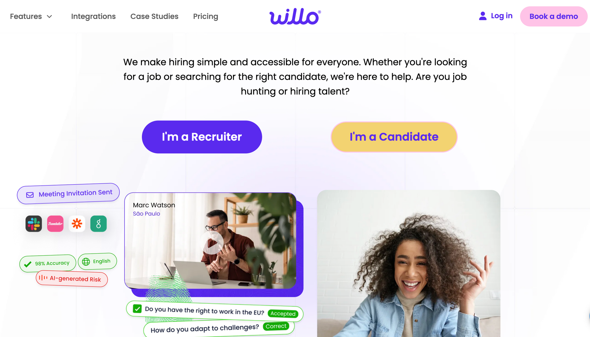Willo follows the "assessment" line of work with features such as text based answers, multiple choice etc. as well as asynchronous interviews. The platform offers branding customization, allowing businesses to maintain a professional image throughout the hiring process. Its broader focus can help if one is looking to capture text from candidates etc. while still having some capability of capturing video.